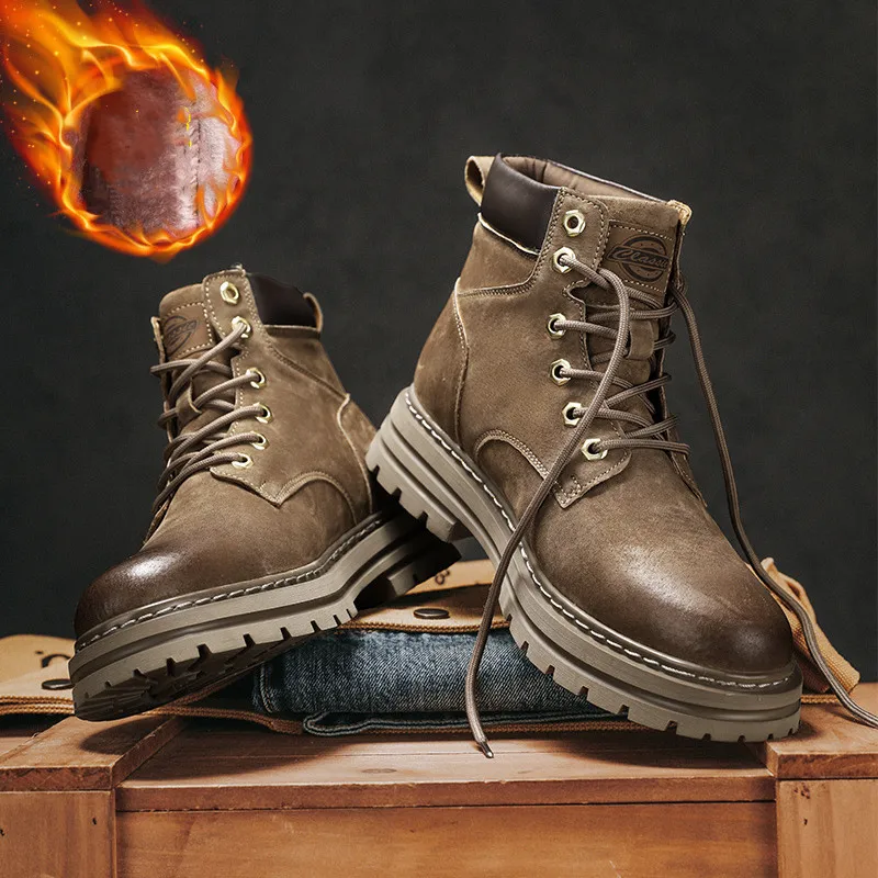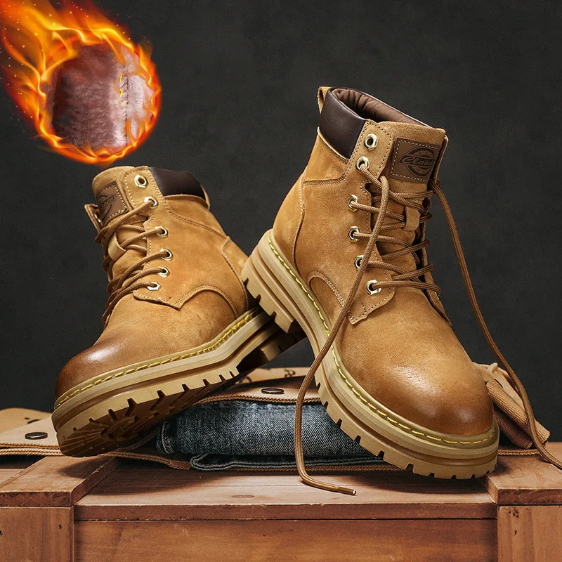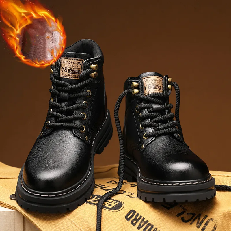 Keep Warm Fluffy Genuine Leather Boots Martin Ankle Waterproof Rubber Platform Fur Black Yellow Brown Snow Boots for Men Winter
